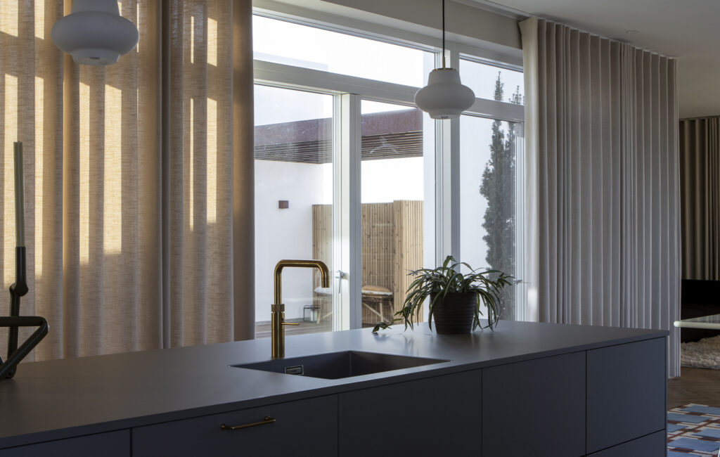 Mange hjem har en åben indretning med fx køkken-alrum, og det stiller en del andre krav til gardinerne. De skal passe til indretningen i begge rum, og samtidig være nemme og fleksible at tilpasse efter døgnets forskellige behov. Et tip er at vælge et ensfarvet gardin, som beroliger og samler farvevalget i rummene.